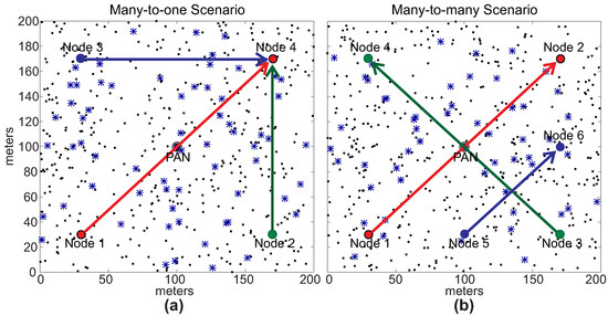 Figure 31. Scenarios considering multiples source-to-destination traffics: (a) Many-to-one message streams; (b) Many-to-many message streams.