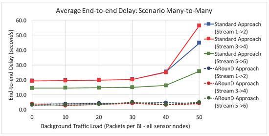 Figure 34. Average end-to-end delay for multiple many-to-many message streams, considering the ARounD Approach vs. Standard Approach under different traffic loads imposed by sensor nodes.