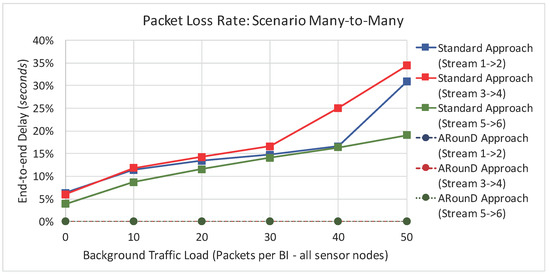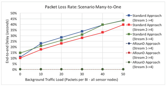 Figure 35. Packet Loss Rate for multiple many-to-one message streams, considering the ARounD Approach vs. Standard Approach under different traffic loads imposed by sensor nodes.