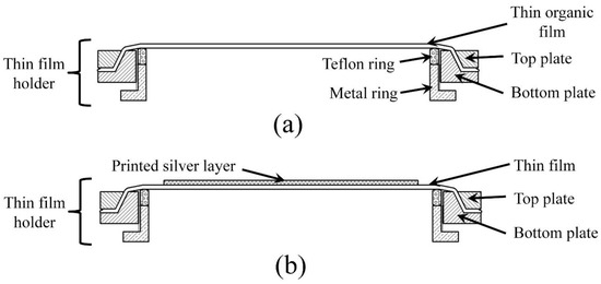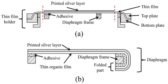 Schematic diagram of the cross-sectional view: (a) after gluing the diaphragm frame to the thin film with the printed electrode fixed on the thin film holder; (b) final diaphragm after separating from the large film holder.