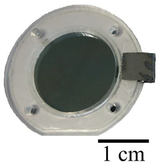 Adhesive was then used to attach a rigid diaphragm frame on the thin organic film, opposite to that of the printed conductive layer. Thereafter, the diaphragm was cut off from the film holder (Figure 2a), and as illustrated in Figure 2b, the extended part of thin film with the conductive layer was folded in one portion and glued to the opposite surface of the frame to obtain electrical connection from both directions. Figure 3 presents the printed circular diaphragm. More details about printing of the conductive layer on thin Mylar film can be found in [4].