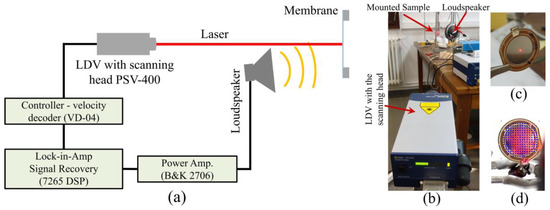 The experimental setup for the laser Doppler vibrometer (LDV) measurement: (a) schematic diagram; (b) photograph of the setup; (c) position of the laser spot at the center of the membrane for single-point mode measurement; and (d) the grid used for the laser during the scanning mode measurement.