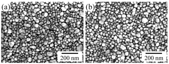 Electrical measurements have shown that the conductivity of the printed silver layer sintered at 140 °C for 30 min is 1.4 × 107 S/m ± 0.1 × 107 S/m compared to the conductivity of bulk silver of 6.3 × 107 S/m [31,32,33]. The achieved conductivity of the printed silver layer is satisfactory, and can be explained by the neck formation between the nanoparticles due to material transfer between them during sintering. The microstructures of the sintered printed silver layers after drying at 90 °C and sintering at 140 °C for 30 min, respectively, are presented in Figure 6.