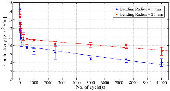 It has been observed that the printed layers were mechanically stable and attached to the thin polymer film. However, a decrease in conductivity of the printed silver layers is noticed with the increasing number of bending cycles (Figure 7). After 10,000 cycles, the conductivity is 8.0 × 106 S/m ± 0.5 × 106 S/m and 9.3 × 106 S/m ± 0.5 × 106 S/m for bending radii of 5 mm and 25 mm, respectively. The initial sharp decrease of the conductivity of printed silver layers might be due to the initial stretching of the thin polymer film due to the applied load, which is stabilized after 250 cycles. This increase in resistance is also caused by the formation of local small micro-cracks on the printed layers due to stretching and bending, as illustrated in Figure 8.