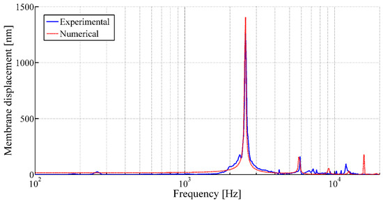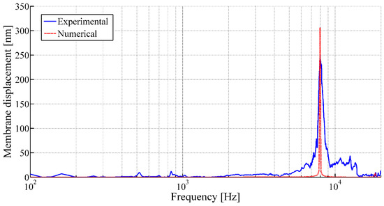 The vibrational behaviors of the membranes are studied using LDV in single-point mode. Figure 9 and Figure 10 illustrate the frequency responses of the membranes having a membrane radius of 10 mm and 4 mm, respectively, for a membrane thickness of 8 µm along with the numerical simulation results.