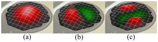Different modes of the vibrations of the membrane with a membrane radius of 10 mm and a membrane thickness of 8 µm using pre-tension Mylar thin film observed using LDV in scanning mode: (a) Mode (1,0) at 2540 Hz; (b) Mode (1,1) at 4030 Hz; and (c) Mode (1,2) at 5505 Hz.