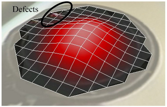 Compared to the numerical analysis, the experimental response of these membranes often shows undesired peaks and inconsistency, as observed from Figure 10, which could be related to the appearance of defects during fabrication. It has been demonstrated that the LDV study in scanning mode allows highlighting the defects of the membranes, as well. These defects generally arise at the boundary of the membrane and could be related to a gluing problem of the pre-tensed film with the frame. The defects may have caused non-linearity in the membrane tension and thus disturb the membrane behavior. The scanning mode observation of membranes having a membrane radius of 10 mm and 4 mm, respectively, for a membrane thickness of 8 µm fixed at its periphery, as illustrated in Figure 12 and Figure 13, have confirmed the hypothesis. The observations from the scanning mode of LDV, are in good agreement with the membranes’ behaviors. The membrane with smaller defects (Figure 12) exhibits similarities with the numerical results (Figure 9), whereas the membrane with higher amount boundary defects (Figure 13) showed more divergence compared to the numerical result (Figure 10).
