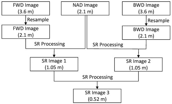 Resample the forward and backward images. Register the nadir image and the resampled forward and backward images using the motion estimation method proposed by Vandewalle []. Next, reconstruct the registered nadir image and resampled forward image via the method of robust super-resolution []. Thus, a higher-resolution image is created from the nadir image and resampled forward and backward images. Meanwhile, similar processing is carried out for the nadir image and the resampled backward image.