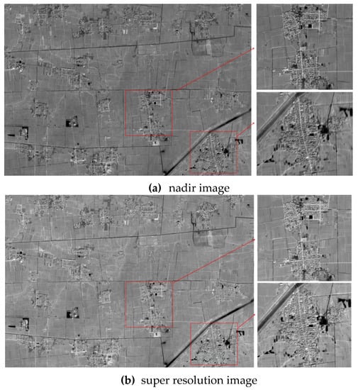 With the help of motion estimation and robust SR processing, an SR image of ZY-3 TLC images is developed. As shown in the SR image, the clarity, sharpness, and detail are obviously improved compared with those of the original nadir image, forward image, and backward image (Figure 2).