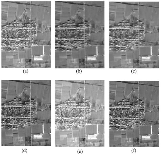 Comparison of the experimental ZY-3 image from nadir image, forward image, backward image, and super resolution image from forward image + nadir image, and super resolution image from backward image + nadir image, and SR image for all TLC images: (a) the nadir image; (b) the forward image; (c)the backward image; (d) the super resolution image from the nadir image + forward image; (e) the super resolution image from the nadir image + the backward image; (f) the super resolution from (d) + (e).