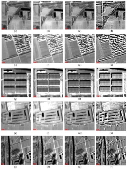 Detail comparisons of experimental ZY-3 images and corresponding super resolution images for different ground objects. These images are all clipped from our experimental images. From left to right of each column, the images are the forward images, the backward images, the nadir images, and their super resolution images, respectively. Different rows show different ground objects, and images from to the up down describe the paths and the canals, the paths and resident buildings, the factory buildings, the reservoirs and lands, the paths and lands, respectively . For example, from (a–d), we can see clearly the path and the canal in super resolution image (d), which are too blur to be identified in each individual ZY-3 image (the forward image (a), the backward image (b), and the nadir image (c)).