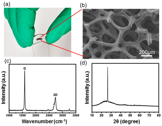 (a) Photograph of the acoustic pressure sensor; (b) SEM image of 3D graphene foam; (c) Raman spectrum of the 3D GF; (d) XRD patterns of the 3D GF.