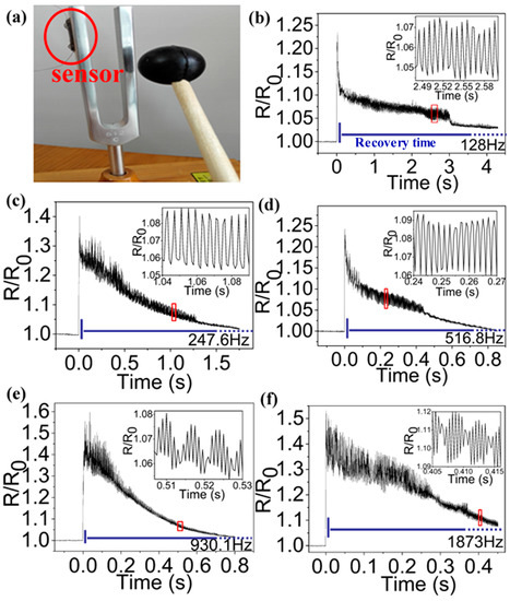 Figure 3a is a photograph of the experiment setup to test the acoustic waves of the tuning forks. The sensor is adhered to one arm of the tuning fork. The tuning fork begins to vibrate when the other arm is stroked with a rubber hammer. The sensor is shaking, resulting in the dynamic variation on its resistance. Figure 3b–f show the variation of its resistance caused by the tuning fork vibration. The signals of Figure 3b–f were obtained by the tuning forks with natural frequency, respectively.