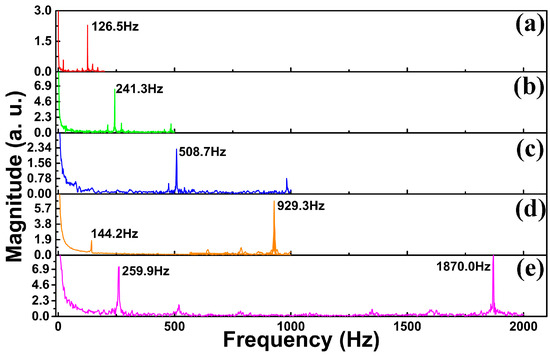 Figure 4 is the spectra of insets of Figure 3b–f with fast Fourier transform (FFT) algorithm. It shows that the five main frequencies of the acoustics are, respectively, 126.5 Hz, 241.3 Hz, 508.7 Hz, 929.3 Hz, and 1870 Hz. They are nearly equal to the natural frequency of the tuning fork. It indicates that the sensor can detect the natural frequency of the tuning fork. There is a small deviation between these two sets of values, because the frequency of the tuning fork is determined by the tuning fork structure, which changes when the sensor contacts the tuning fork, resulting in a small change in the frequency.