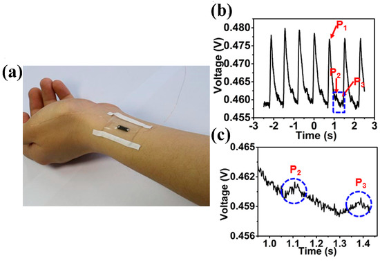 (a) Wrist pulse signal test with GF/PDMS sensor; (b) Typical radial artery pulse waveform obtained from GF/PDMS sensor; (c) Magnified peaks of P2 and P3 in (b).