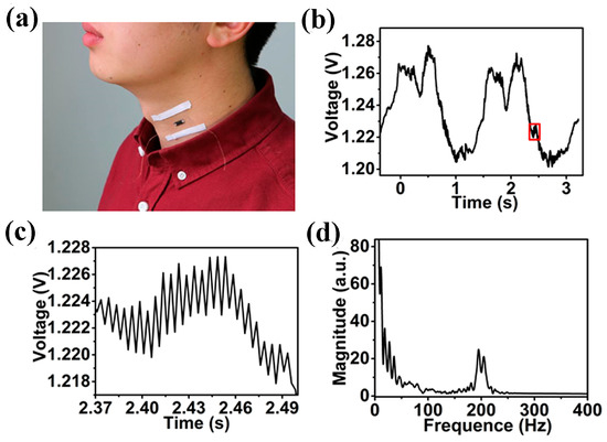 (a) Phonation signal test with GF/PDMS sensor; (b) The measured GF/PDMS sensor signal when a tester is speaking Chinese characters “Nanjing”; (c) The amplified view of high frequency oscillation signal in Figure 6b; (d) Fast Fourier transform of high frequency oscillation signal.