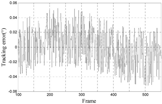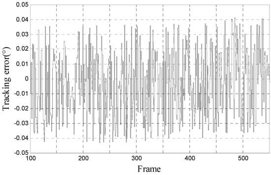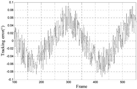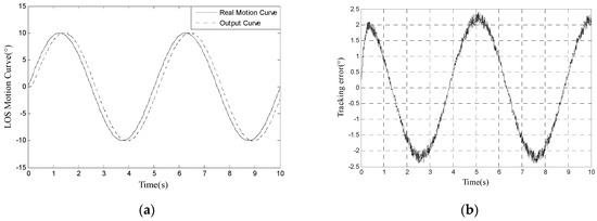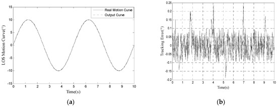 We use the proposed method to track 10° 0.2 Hz input signal and the LOS motion curve is shown in Figure 7a. The real motion curve and the output curve are almost overlapped because the amplitude of LOS motion curve is far bigger than tracking error. The tracking error is shown in Figure 7b. In Figure 7b, we can calculate that RMS error is 0.0673°, which satisfies engineering indicator 1.5 mrad (0.0860°).