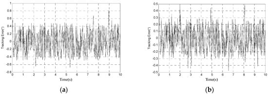 (a) Tracking error of Kalman filter when when tracking 10° 0.2 Hz signal; and (b) tracking error of H∞ filter when when tracking 10° 0.2 Hz signal.