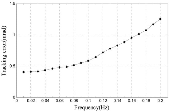 By tracking experiments of moving target with amplitude 10° and frequency less than 0.2 Hz, we obtain the relationship of tracking error and frequency, as shown in Figure 13. It shows that tracking error is less than 1.253 mrad under the situation that amplitude is 10° and frequency is less than 0.2 Hz, which is similar to simulation result (1.175 mrad).
