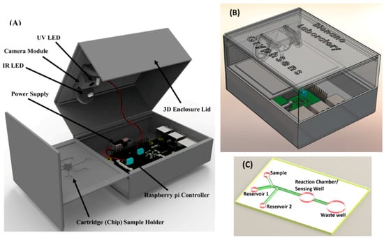 3D view of the developed GryphSens diagnostic sensor. (A) The detector comprises a sensor enclosure, 3D-printed lid, cartridge holder, and Raspberry Pi, UV and IR LED excitation sources, battery, and camera module; (B) 3D-rendered view of a fully assembled GryphSens diagnostic reader. The dimensions of the enclosed reader are 100 mm × 60 mm × 66 mm; (C). Schematic of the disposable analytical cartridge showing the microfluidic connections and reservoirs (not to scale).