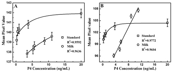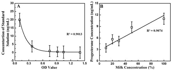 (A) Relation between the concentration of the standard solution and the measured optical density (OD) for the reference ELISA assay performed in the plate reader according to the Abraxis procedure; (B) Calibration curve between progesterone P4 concentration and the measured optical density (OD).