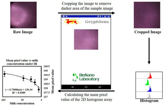 Flowchart illustrating the image processing procedure, including cropping, red, green, and blue (RGB) histogram extraction, and calculation of the mean pixel value.