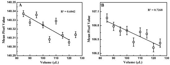 Sample volume is a parameter that affects sensor performance. Its influence was assessed to ensure the correct operation of the instrument. Figure 4 shows the correlation between the mean pixel value and a sample volume between 85 µL and 125 µL for both IR (A) and UV (B) illuminations. The standard solution at 0.23 ng/mL of progesterone was used for this measurement. A linear trend between the mean pixel value and the sample volume can be observed. The mean pixel value decreases as the volume of the sample increases, but occasionally deviates from the linear regression curve (R2 = 0.60 and 0.73, respectively). Since the mean pixel value for a 100-µL sample volume intercepts the linear regression fit under IR and UV illumination, all subsequent tests were performed with a volume of 100 µL, which seemed optimal for the signal-to-noise ratio in our reader.