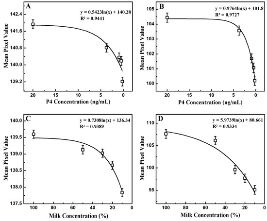 Evolution of the mean pixel value with progesterone P4 concentration in the standard solutions under IR (A) and UV (B) illumination and with milk concentration in the milk samples under IR (C) and UV (D) light.