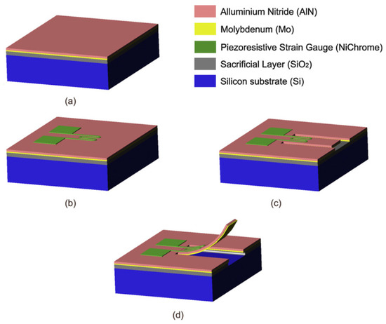 The MEMS fabrication process for an aluminum nitride/molybdenum based flow sensor. The process is subdivided into four main steps, that is (a) depositing functional material layers; (b) depositing piezoresistors and contact pads (thermal evaporation); (c) defining the cantilever U-shape (dry etching); and (d) releasing the cantilever (wet etching). Reproduced from Qualtieri et al. [26] with permission of Elsevier B.V.