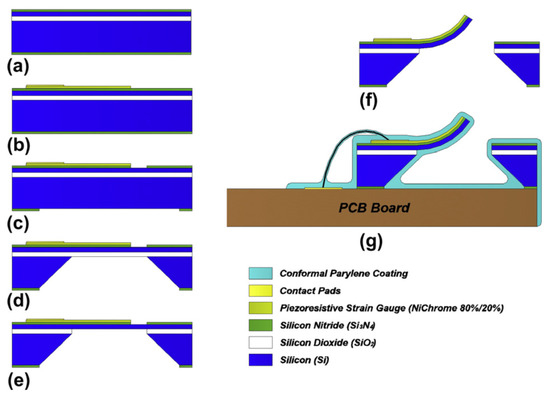 The MEMS fabrication process for a silicon nitride/silicon-based flow sensor. The process is subdivided into five main steps, that is: (a) depositing functional material layers; (b) depositing piezoresistors and contact pads (thermal evaporation); (c) defining the cantilever U-shape (dry etching); (d–f) releasing the cantilever (wet etching); and (g) waterproofing the sensor (chemical vapor deposition). Reproduced from Qualtieri et al. [38] with permission of Elsevier B.V.