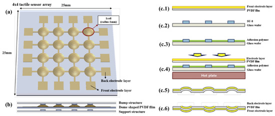 Feng et al. [42] proposed the development of piezoelectric Dome-Shaped-Diaphragm Transducers (DSDTs) because 3D structures are able to achieve higher sensitivity than their planar counterparts by concentrating the applied pressure at the center of the piezoelectric curved cell. Afterwards Li et al. [29] realized this innovative 3D dome-shape P(VDF-TrFE) tactile sensor using a mold-transfer method from a cyclic-olifen-copolymer (COC) lens mold and standard MEMS techniques. To maintain the shape of the final sensor, the cavity of the domes was filled with implantable-grade silicone adhesive. Kim et al. [30] also demonstrated that a dome-shaped piezoelectric tactile sensor fabricated by an inflation technique can achieve higher sensitivity than the conventional flat structures. They conceptually fabricated the final sensor by trapping and inflating the air by means of a pre-polarized film of PVDF, a glass wafer and a face structure. A silver electrode layer (thickness = 10 ) was deposited on a PVDF film by screen printing. Then, 250 -thick SU-8 structures were patterned on a glass wafer and used for local deformation of the PVDF film once the film is attached on the glass substrate. Through subsequent heat treatments, allowing the PVDF film to change shape, air was inflated and trapped underneath the locally deformed PVDF regions to achieve the desired dome geometry. The PVDF film was then released from the glass wafer. Finally, the PVDF film was turned upside down, and the back electrode layer was deposited by screen printing. Figure 5 displays the schematic illustration and the fabrication steps for the dome-shaped tactile sensors described by Kim et al. [30].