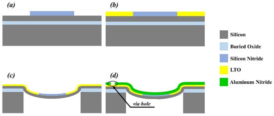 Cross-sectional view of the concave-shape pMUT (piezoelectric Micromachined Ultrasonic Transducer) generated by compressive residual stress of SiN and Low Temperature Oxide (LTO). (a) SiN deposition and patterning; (b) LTO deposition and Chemical Mechanical Polishing (CMP); (c) backside etching to form the diaphragm; (d) Mo/AlN/Mo deposition. Based on Akhbari et al. [43].