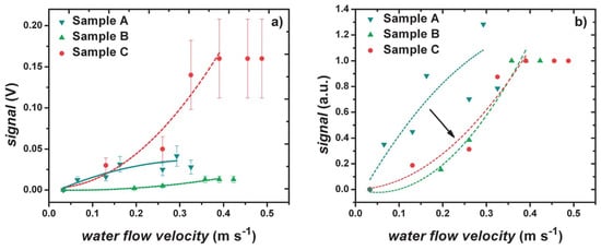 Electrical behavior of three flow sensors with varying material thicknesses under continuous water flow conditions. The 0.5 parylene coating (Sample A), 2 parylene coating (Sample B) and 0.3 SiN layer (Sample C). The dashed lines are intended as a visual guideline. (a) The different coating material characteristics result in varying calibration curve shapes, tuning from a sub-linear (strain-hardening) to a super-linear (strain-softening) trend. A common signal saturation region is shown. (b) Normalized output signal: the arrow highlights the different behaviors of the calibration curve, going from lower to higher flexural stiffness. Reproduced from Rizzi et al. [14] with permission of The Royal Society of Chemistry.