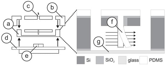 Assembly of a micro-machined optical-based flow sensor. (a) Si-chip; (b) housing; (c) LED; (d) electronics PCB; and (e) optical detector. Magnification: Si-chip featuring a (f) PDMS lamella and (g) glass plate. Dimensions not to scale. Reproduced from Herzog et al. [66].