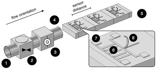 Simplified systematic overview of the experimental setup. Flow pulses pass the following components: (1) non-flexible tubing; (2) mechanical valve; (3) commercial flow rate sensor; (4) tube outlet; and (5) artificial lateral line system with artificial hair cell sensors positioned in a line. Magnification: (6) piezoresistors; (7) contact pads; and (8) cantilever beam. Flow orientation and sensor distance are indicated. Dimensions not to scale. Reproduced from Abels et al. [68] with permission of IOP Publishing.