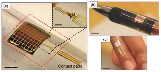 Photographs of a thin conformable piezoelectric pressure sensor. (a) Device wrapped on a cylindrical glass support (scale bar, 5 ); (b) sensor wrapped on a pen; and (c) a finger (scale bar, 10 ). Reproduced from Dagdeviren et al. [39] with permission of Macmillan Publishers Limited.