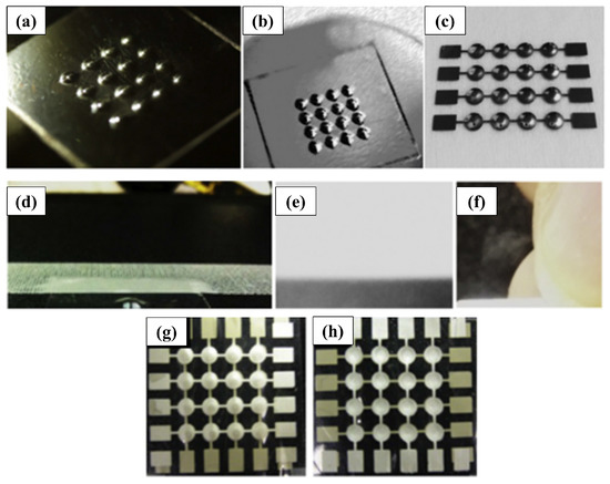 Optical photographs of the fabricated dome-shaped PVDF film and tactile sensors. (a–f) The fabricated dome-shaped PVDF film (height = 500 ). (g,h) The proposed dome-shaped tactile sensor. Reproduced from Kim et al. [30] with permission of Elsevier B.V.