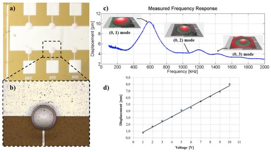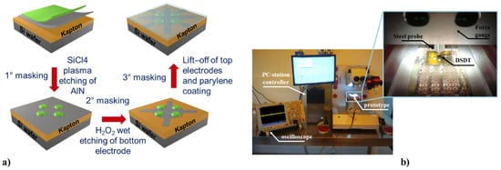 A different process was reported by Mastronardi et al. [27,28]. They designed and fabricated aluminum nitride-based domed circular membranes using the following standard microfabrication process. A Mo/AlN/Mo material stack was deposited on a general purpose Kapton HN (DuPont) flexible substrate, previously laminated on a silicon wafer that acted as rigid support during the microfabrication steps. The AlN thin film, with a thickness of about 1 , was deposited at moderately high temperature (about 250–300 ) through reactive sputtering from a highly pure Al target. After a first masking photolithography, the top Mo and the AlN layers were etched into a circular shape by ICP etching. Next, the Mo bottom common electrode was patterned. In order to define the top electrodes, an additional metal deposition, followed by lift-off patterning was performed. Electrical connections were bonded in a subsequent step. Finally, to prevent external mechanical damages and to electrically isolate the piezoelectric transducers, a parylene C coating of 1 was deposited via chemical vapor deposition. The conformal nature of the parylene C coating allowed a full electrical and mechanical isolation of the final device.