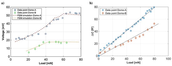 Electrical characterization of dome-shaped devices with different releasing heights. (a) The output voltage at the peak is reported vs. the applied force (Dome A, height 43 , uplifted radius 1.5 and stiffness 3.5 ; Dome B, height 33 , uplifted radius 1.2 and stiffness 9.7 ); (b) the detection of long static stimuli has been experimentally and analytically observed as capacitance decrease at increasing forces up to 80 of contact force. Reproduced from Mastronardi et al. [27] with permission of AIP Publishing.