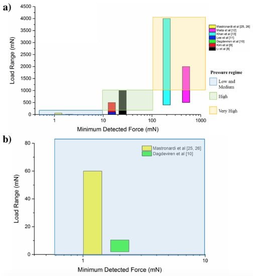 Pressure detection in the low and medium, high and very high pressure regime. (a) Mapping of the listed devices (Table 2) to their detectable load ranges; (b) magnification of the low and medium pressure regime.