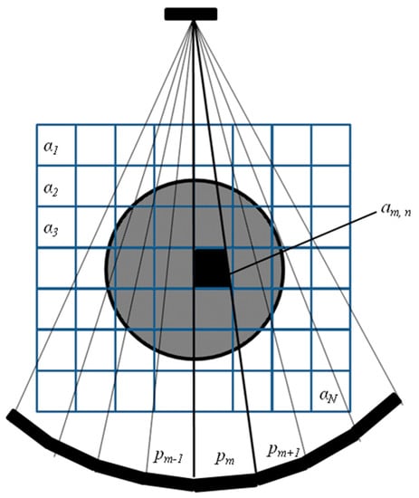 Algebraic tomographic reconstruction techniques are based on the discretization of the former spatial-distribution with an  cells grid, as shown in Figure 1. Thus, the expression in Equation (1) takes the following form: