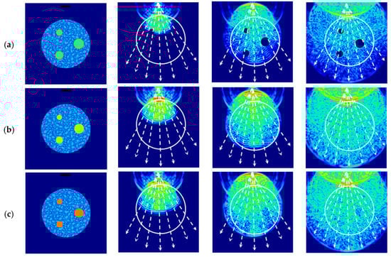 The same scenarios and materials were used in the numerical simulations and the experiments. The designed scenarios were 2D models, as shown in Figure 2 (column 1). These represent a 250 mm square water medium with a circular specimen (Ø 150 mm) and three circular inclusions of different diameters, as shown in Table 1. The selected inclusion materials were PVC, aluminium and steel.