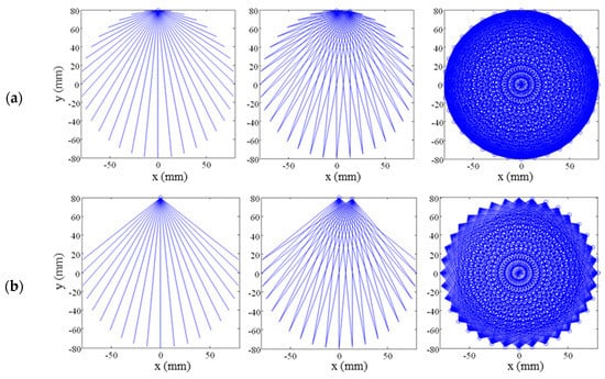 Simulation of rays for the tomographic scan: (a) without the restriction angle and (b) with a restricted angle of 75°.