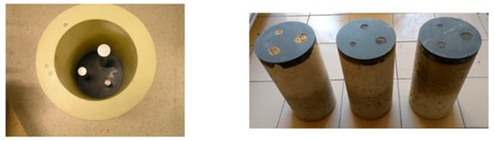 Three cylindrical specimens (Ø 150 mm × 300 mm) were moulded according to the EN 12390-2 norm [] and kept in a laboratory environment for 1 day. The specimens were then removed from the mold and stored in water over a 28 day curing process until the inspections were carried out.