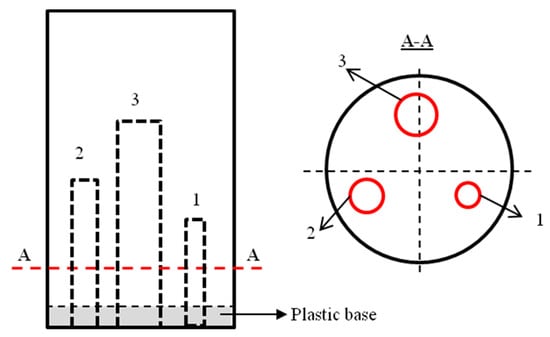 Concrete specimens with different sizes and inclusion materials (aluminium, steel, and PVC tubes) were made. Three inclusions of different diameters and heights, as shown in Table 3, were placed in each mold before fabrication at different heights (Figure 5). The bars and tubes were fixed in a plastic base that was placed into the mould before the specimen fabrication, since the specimen height was 270 mm. The PVC tubes were sealed to prevent their filling with concrete during the manufacturing process.