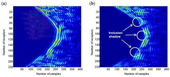Figure 6 shows a B-scan image of the concrete specimen with PVC tubes at a height without PVC tubes (Figure 6a) and at a height with three PVC tubes (Figure 6b). The images show the set of signals collected by the 220 receivers. The wavefront is curved due to the relative positions between the emitters and the receivers. The presence of inclusions causes small footprints in the wavefront (Figure 6b).