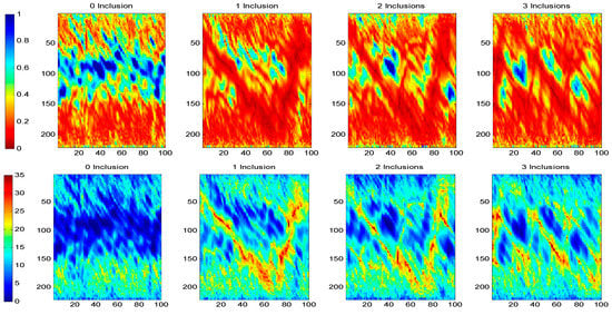 Concrete is a heterogeneous material. Therefore, ultrasonic waves have a complex propagation pattern in which different physical phenomena, such as reflection, diffraction, scattering and mode conversion interact in such a way that can mask the relevant information about embedded structures []. In order to consider this aspect, a high strength concrete has been used in which the maximum size of the aggregates is similar to that of the embedded inclusions. Ultrasonic images of a highly heterogeneous concrete with multiple inclusions are complex to interpret. Therefore, detection and estimation of embedded materials are difficult problems [].