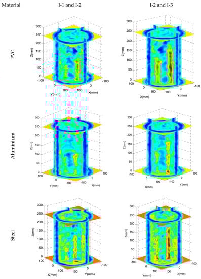 In Figure 8 it can be seen that not all the tomograms detect the embedded materials. Detectability of steel bars and PVC tubes are similar, both have different acoustical impedances compared to concrete resulting in high contrast reconstructed images. On the other hand, aluminium bars with a similar acoustical impedance to concrete have the lowest detectability figures. Regarding the sizes of the inclusions, I-1 inclusions are difficult to detect because their size is similar to the size of concrete aggregates and the ultrasonic wavelength. Again, steel bars and PVC inclusions behave in a similar way while aluminium bars have the lowest figures. These results agree with the numerical simulation conclusions.