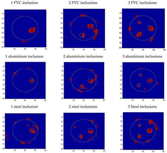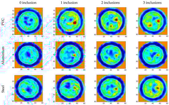 A series of tomogram slices have been selected where 0, 1, 2 and 3 inclusions are detected in order to show partial results, Figure 9. All the images are 80 × 80 pixels; each side of an image is physically equivalent to the external diameter of the ring of the inspection system, which means that each pixel represents a 3 mm length. Thus, the concrete specimens, as shown in the reconstructed tomographic images, are 50 pixels in diameter. A blue external ring can also be observed in the experimental reconstruction images. This ring is formed by the multiple echoes produced in the aluminium ring of the inspection system.