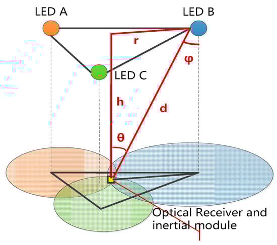 where , , and are the positions of LED A, LED B, and LED C; the terms , , and represent the distance from the LED A/B/C to the module; and is the position of the module. To facilitate discussion, we regard the VLC position at time k as .